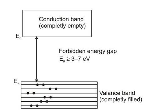 It is a solid in which the energy band formation takes place in such a manner, that the valence band is completely filled while the conduction band is completely empty. In addition to this, these two bands are separated by a large energy gap called forbidden energy gap or band gap. If and respectively denotes the minimum energy in conduction band and the maximum energy in valence band then band gap is defined as