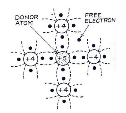 When a pentavalent impurity atom (such as Antimony, Phosphorus or Arsenic) is added to pure semiconductor like Ge or Si crystal, it replaces a Ge or Si atom in the crystal lattice. Four of the five valence electrons of the impurity atom form covalent bonds with one with each valence electron of four Ge (or Si ) atoms surrounding. Thus, by adding pentavalent impurity to the pure Ge (or Si ), the number of free electrons increases which ultimately increases the conductivity of the crystal. The impure Ge (or Si ) crystal is known as an 'n-type' semiconductor because it has an excess of 'negative' charge-carrier (electrons). The impurity atoms are known as 'donor' atoms because they donate conducting electrons to the crystal.