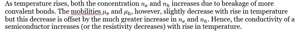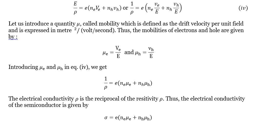 This is the required expression which proves that the electrical conductivity of a semiconductor depends upon the electron and hole concentrations (number densities) and their mobilities. The mobility of electrons is higher than the hole mobility.