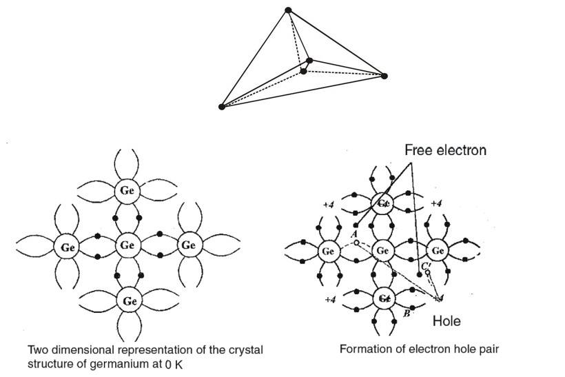 Both elements crystallize in such a way that each atom in the crystal is inside a tetrahedron formed by the four atoms which are closest to it. Figure shows one of these tetrahedral units. Each atom shares its four valence electrons with its immediate neighbours on a one to one basis, so that each atom is involved in four covalent bonds. For convenience, a two dimensional representation of the crystal structure for germanium is shown in figure, which can also be used for silicon (as only covalent bands are being shown).