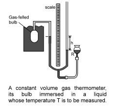 The standard thermometer, against which all other thermometers are calibrated, is based on the pressure of a gas in a fixed volume. Figure shows such a constant volume gas thermometer; it consists of a gas-filled bulb connected by a tube to a mercury monometer.