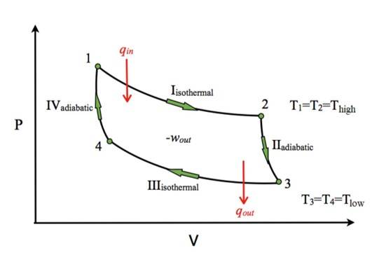 Secondly, this Carnot Engine requires four sequentially paired thermodynamic processes (isothermal and adiabatic) that work as a cycle between the two reservoirs. We explain this more below.