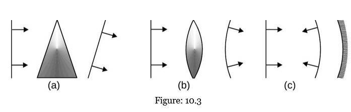 Once we know the laws of reflection and refraction, we can learn the behaviour of prisms, lenses, and mirrors. To explain the behaviour of the wavefronts in these three cases (Fig. 10.3)