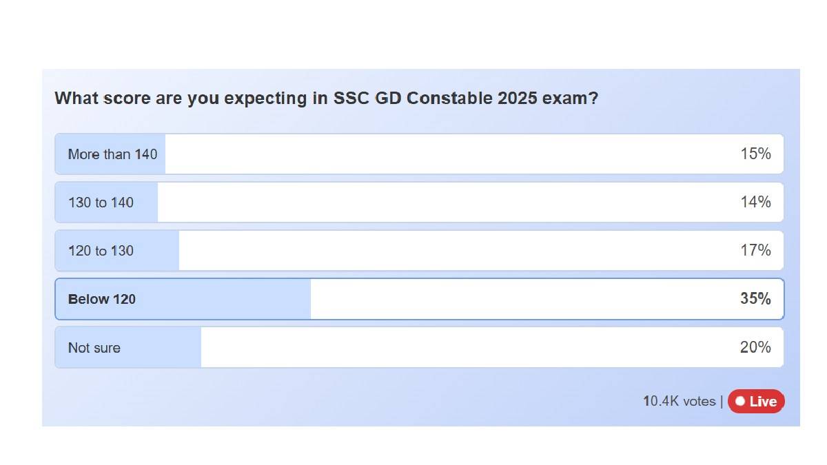 SSC GD Constable result 2025 is expected soon at ssc.gov.in. As candidates across the country await the SSC GD result and scorecard, a recent poll reveals expectations regarding the SSC GD scores. According to the poll response, 35 per cent of candidates expect their scores in the SSC GD 2025 exam to be below 120. Read further to know what lies ahead post the result declaration.