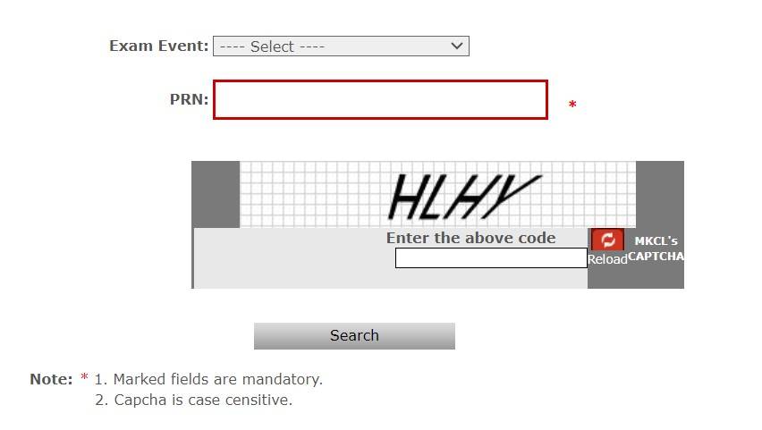 Step 6: Select the exam event and enter the 16-digit PRN number and the code. If students don't remember the no., they will have to do the YCMOU result PRN search.