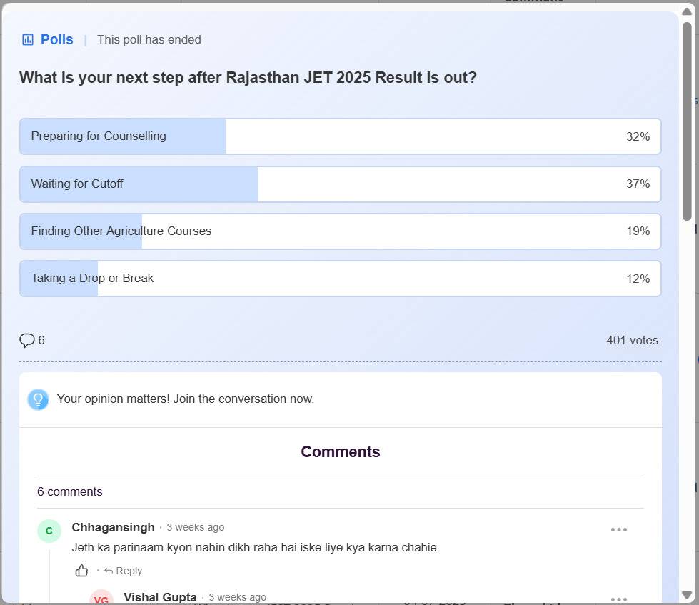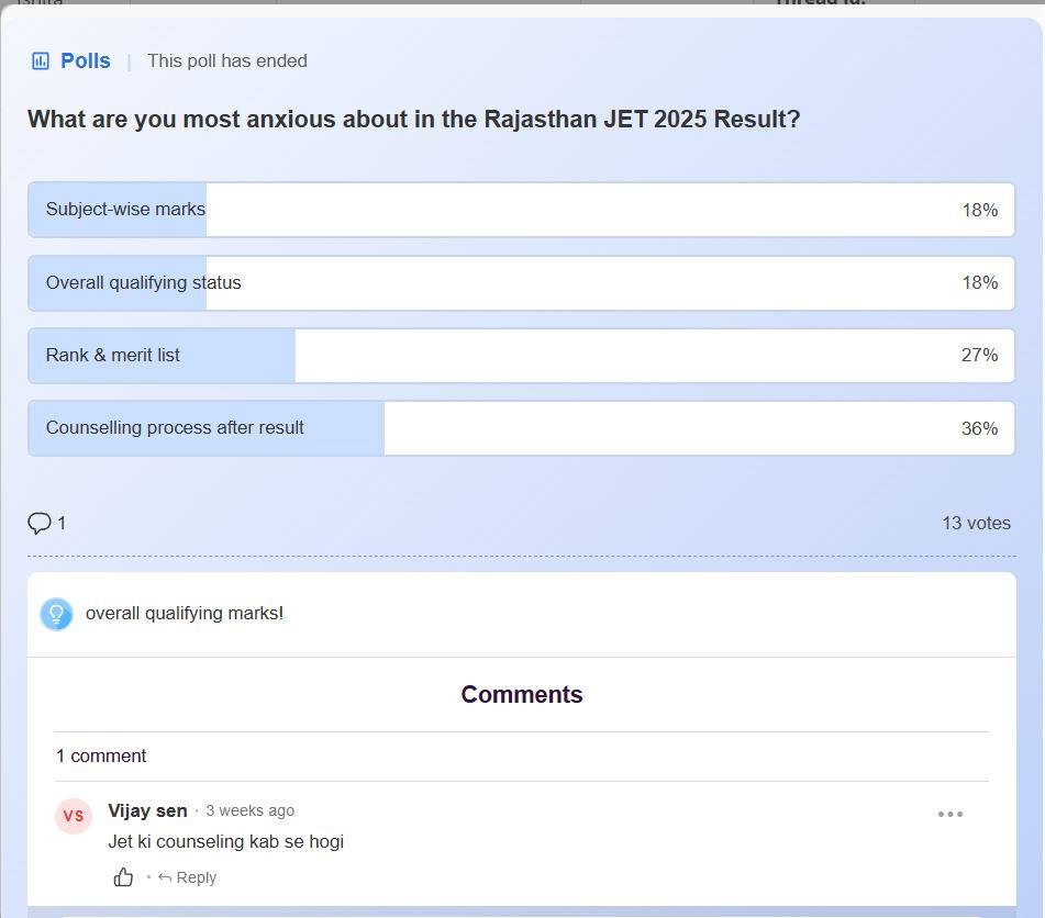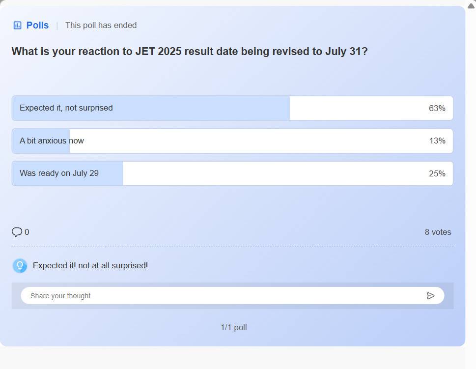 This helps both students and the Rajasthan JET exam conducting authority to review these opinions and gain a comprehensive understanding of the entire situation. Therefore, in this Shiksha article, we decided to share some of the most common feedback, opinions of the JET 2025 Exam takers based on live poll data. This will include JET aspirants’ opinions on the Rajasthan JET Result date, the Rajasthan JET Counselling Process, and the JET cutoff.