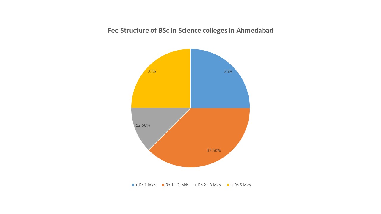 Based on the below pie chart, it can be estimated that pursuing BSc in full-time mode in Science colleges in Ahmedabad is highly affordable as 2 of 8 colleges/universities (25%) charge less than Rs 1 lakh as course fees. These colleges are: