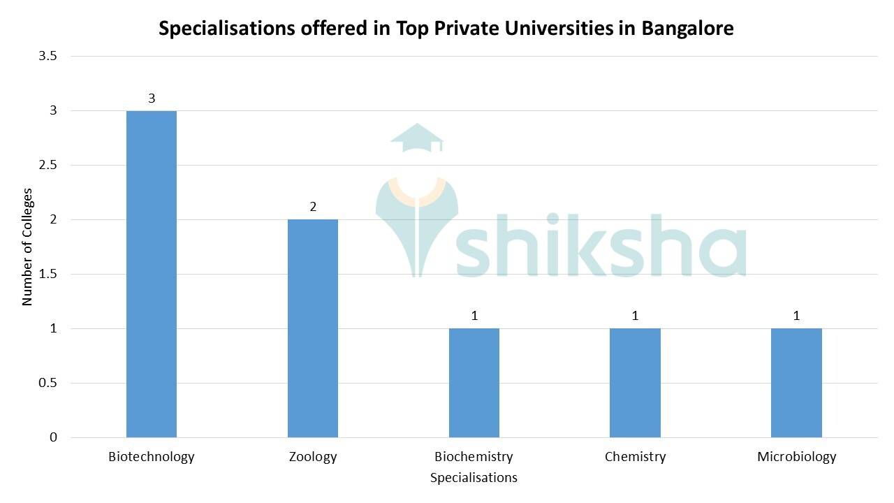 A: There are various specialisations offered in Private Universities in Bangalore. The top specialisations offered in Biotechnology, Zoology, Biochemistry, Chemistry, and Microbiology.