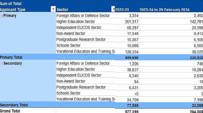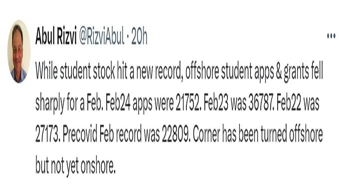 "While student stock hit a new record, offshore student apps & grants fell sharply for a Feb. Feb24 apps were 21752. Feb23 was 36787. Feb22 was 27173. Precovid Feb record was 22809. Corner has been turned offshore but not yet onshore," reads his message on the X platform.