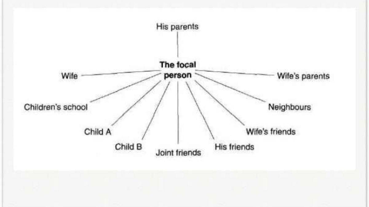 A Any individual in any situation occupies a role in relation to other people. The particular individual with whom one is concerned in the analysis of any situation is usually given the name of focal person. He has the focal role and can be regarded as sitting in the middle of a group of people, with whom he interacts in some way in that situation. This group of people is called his role set. For instance, in the family situation, an individual’s role set might be shown as in Figure 6.