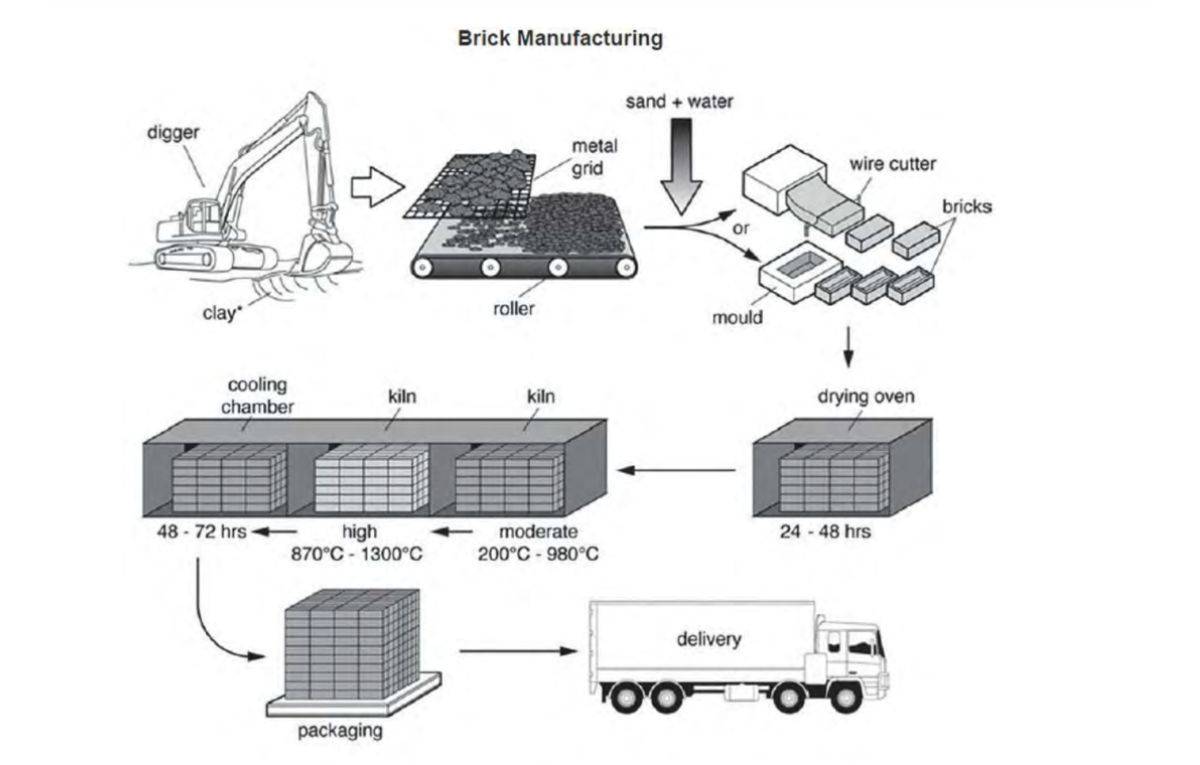| The diagram below shows the process by which bricks are manufactured for the building industry. Summarise the information by selecting and reporting the main features and make comparisons where relevant. |