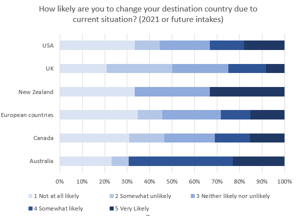 For students who are interested in 2021 or future intakes, we wanted to know if the current situation is likely to have an impact on them changing their study destination. Since every country has its own dynamics, it made more sense to look at this data from the destination country of interest of the survey respondent.