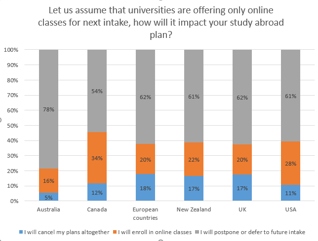Given the recent experience with Australian universities, where a majority of them are not deciding to offer online classes for intake starting in July, we wanted to understand how will students react if a similar situation played out in other countries? This question was only asked for students interested in 2020 intake.