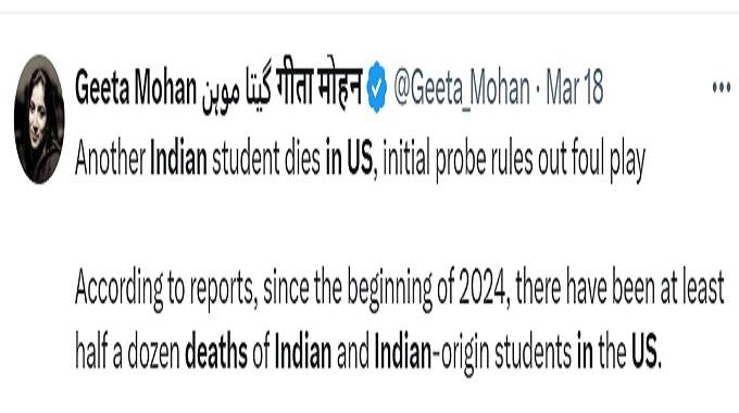 After the sudden deaths of Indian youngsters in the US, the Indian American Community are reportedly in great fear so much so that they are scared to travel alone. The social media platform X is full of reactions, one of the messages read, "Another Indian student dies in US, initial probe rules out foul play According to reports, since the beginning of 2024, there have been at least half a dozen deaths of Indian and Indian-origin students in the US."