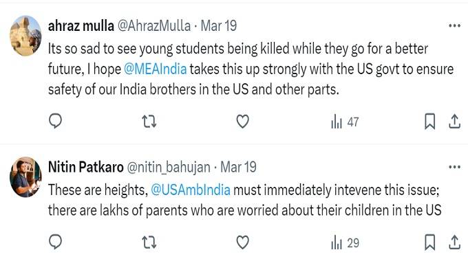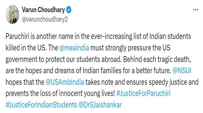 "Paruchiri is another name in the ever-increasing list of Indian students killed in the US. The @meaindia must strongly pressure the US government to protect our students abroad. Behind each tragic death, are the hopes and dreams of Indian families for a better future. @NSUI hopes that the @USAmbIndia takes note and ensures speedy justice and prevents the loss of innocent young lives!," says another message.