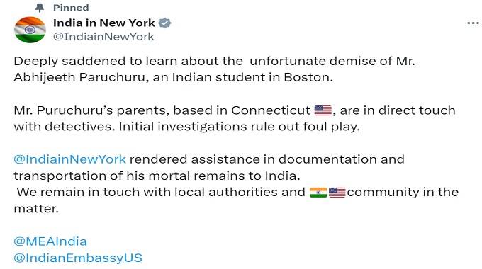 Adding to the tragic coincidences of deaths of Indian students in the USA, Paruchuri Abhijit, a 23-year-old Indian student at Boston University was found dead inside the campus of Boston University. Now, the Consulate General of India in New York has said that the initial investigation reveals that there was no foul play involved in the case. The probe is still going on in the case and the deceased student's parents are in direct touch with the investigators.