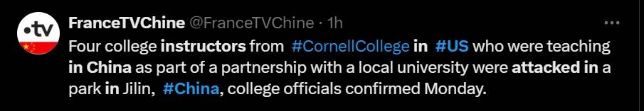 "Four college instructors from #CornellCollege in #US who were teaching in China as part of a partnership with a local university were attacked in a park in Jilin, #China, college officials confirmed Monday," reads a message on X.