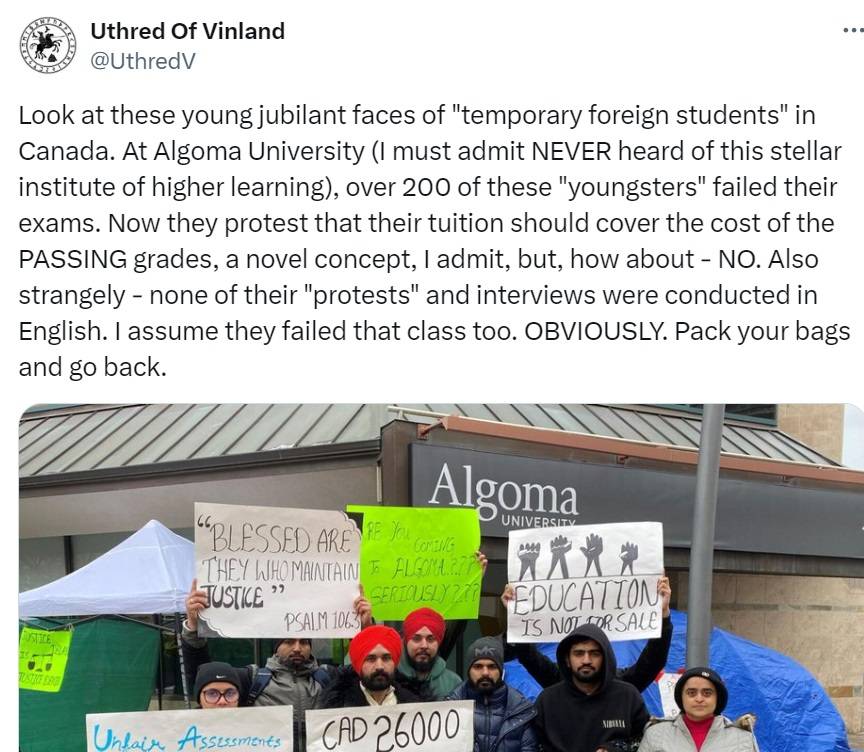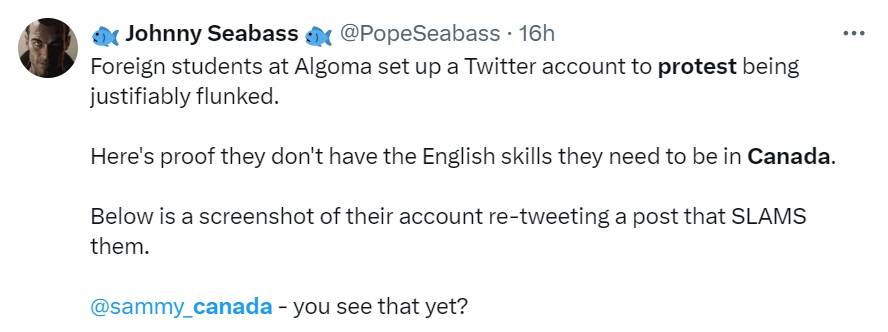 "Foreign students at Algoma set up a Twitter account to protest being justifiably flunked. Here's proof they don't have the English skills they need to be in Canada. Below is a screenshot of their account re-tweeting a post that SLAMS them," reads a message on X.