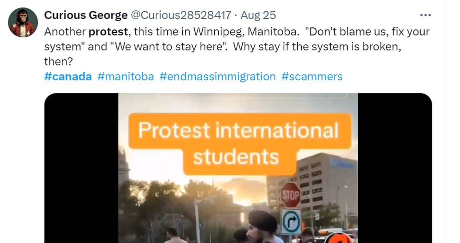 "Another protest, this time in Winnipeg, Manitoba. "Don't blame us, fix your system" and "We want to stay here". Why stay if the system is broken, then?," says a message on X platform.