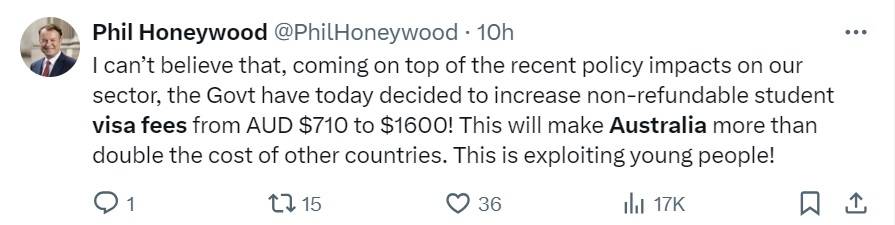 Phil Honeywood, CEO, International Education Association of Australia (IEAA) said on the X platform, "I can’t believe that, coming on top of the recent policy impacts on our sector, the Govt have today decided to increase non-refundable student visa fees from AUD $710 to $1600! This will make Australia more than double the cost of other countries. This is exploiting young people!."