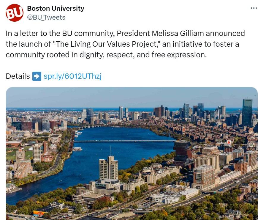 "In a letter to the BU community, President Melissa Gilliam announced the launch of "The Living Our Values Project," an initiative to foster a community rooted in dignity, respect, and free expression," reads the message by Boston University on X platform.