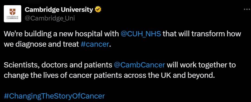 "We're building a new hospital with @CUH_NHS that will transform how we diagnose and treat #cancer. Scientists, doctors and patients @CambCancer will work together to change the lives of cancer patients across the UK and beyond," reads the message of Cambridge University on X platform.