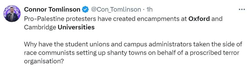 "Pro-Palestine protesters have created encampments at Oxford and Cambridge Universities. Why have the student unions and campus administrators taken the side of race communists setting up shanty towns on behalf of a proscribed terror organisation?," reads a message on X Platform.