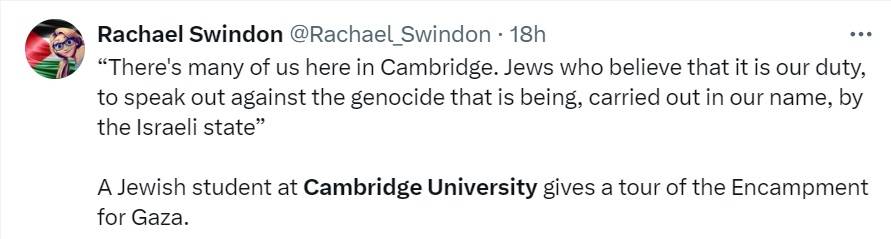 "“There's many of us here in Cambridge. Jews who believe that it is our duty, to speak out against the genocide that is being, carried out in our name, by the Israeli state”. A Jewish student at Cambridge University gives a tour of the Encampment for Gaza, said another message on X Platform.