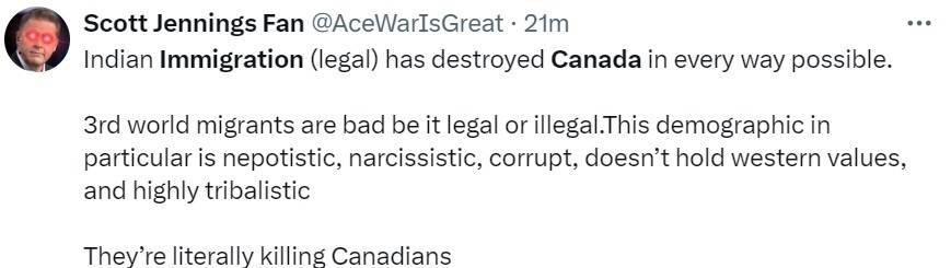 "Indian Immigration (legal) has destroyed Canada in every way possible. 3rd world migrants are bad be it legal or illegal.This demographic in particular is nepotistic, narcissistic, corrupt, doesn’t hold western values, and highly tribalistic. They’re literally killing Canadians," said yet another message on X.