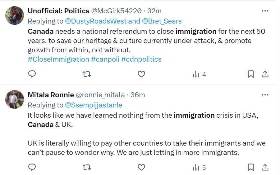 "It looks like we have learned nothing from the immigration crisis in USA, Canada & UK. UK is literally willing to pay other countries to take their immigrants and we can’t pause to wonder why. We are just letting in more immigrants," reads another message on X.