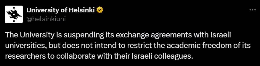 "The University is suspending its exchange agreements with Israeli universities, but does not intend to restrict the academic freedom of its researchers to collaborate with their Israeli colleagues," reads a message by the University of Helsinki on the X platform.