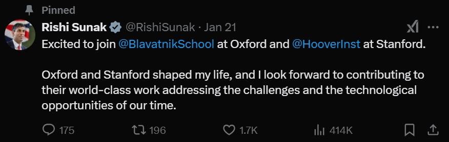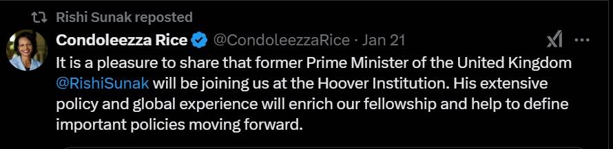 Condoleezza Rice, the director of the Hoover Institution says on X, "It is a pleasure to share that former Prime Minister of the United Kingdom @RishiSunak will be joining us at the Hoover Institution. His extensive policy and global experience will enrich our fellowship and help to define important policies moving forward."