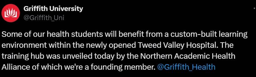 “Some of our health students will benefit from a custom-built learning environment within the newly opened Tweed Valley Hospital. The training hub was unveiled today by the Northern Academic Health Alliance of which we're a founding member,” reads the university’s message on the X platform.