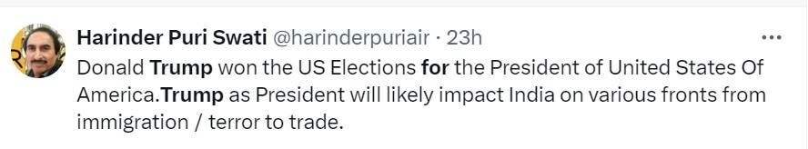 "Donald Trump won the US Elections for the President of United States Of America.Trump as President will likely impact India on various fronts from immigration / terror to trade," says another message on the X platform.