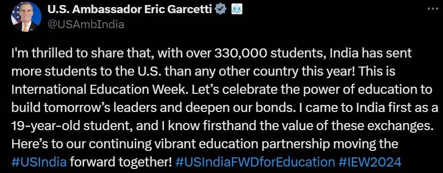 His message on X reads, "I'm thrilled to share that, with over 330,000 students, India has sent more students to the U.S. than any other country this year! This is International Education Week. Let’s celebrate the power of education to build tomorrow’s leaders and deepen our bonds. I came to India first as a 19-year-old student, and I know firsthand the value of these exchanges. Here’s to our continuing vibrant education partnership moving the #USIndia forward together!"