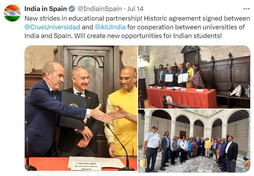 “New strides in educational partnership! Historic agreement signed between @CrueUniversidad and @AIUIndia for cooperation between universities of India and Spain. Will create new opportunities for Indian students!” said a statement by the Embassy of India in Spain on X.