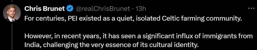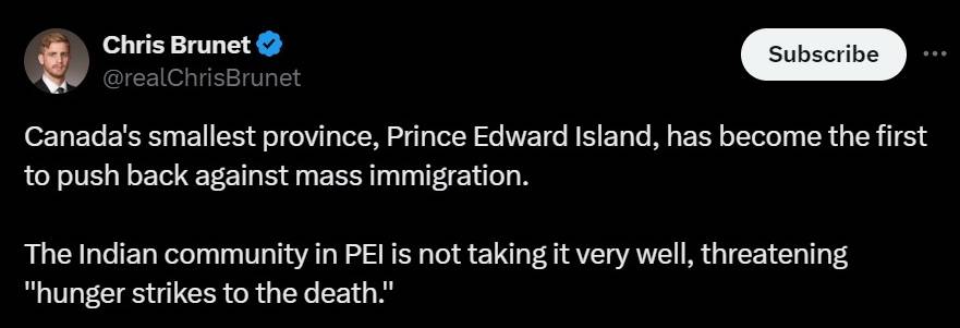 "Canada's smallest province, Prince Edward Island, has become the first to push back against mass immigration. The Indian community in PEI is not taking it very well, threatening ''hunger strikes to the death," reads one of the messages on X.