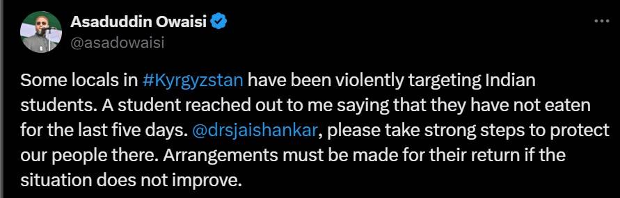 "Some locals in #Kyrgyzstan have been violently targeting Indian students. A student reached out to me saying that they have not eaten for the last five days. @drsjaishankar, please take strong steps to protect our people there. Arrangements must be made for their return if the situation does not improve," he said.