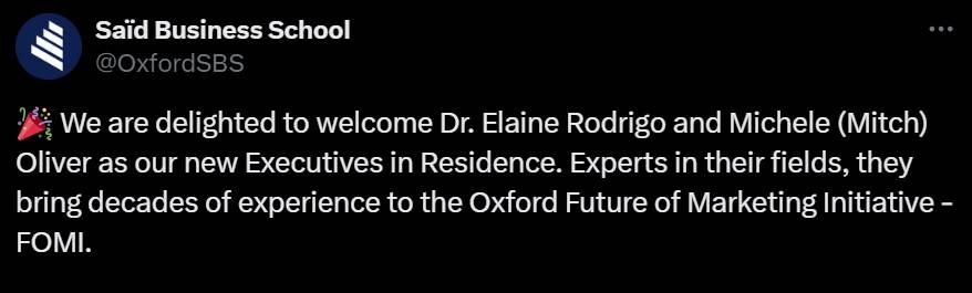 "We are delighted to welcome Dr. Elaine Rodrigo and Michele (Mitch) Oliver as our new Executives in Residence. Experts in their fields, they bring decades of experience to the Oxford Future of Marketing Initiative - FOMI," said another message on X.