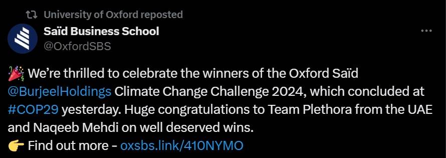 "We’re thrilled to celebrate the winners of the Oxford Saïd @BurjeelHoldings Climate Change Challenge 2024, which concluded at #COP29 yesterday. Huge congratulations to Team Plethora from the UAE and Naqeeb Mehdi on well deserved wins," reads the message of Saïd Business School on X platform.