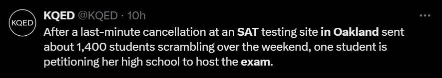 "After a last-minute cancellation at an SAT testing site in Oakland sent about 1,400 students scrambling over the weekend, one student is petitioning her high school to host the exam," reads a message on X.