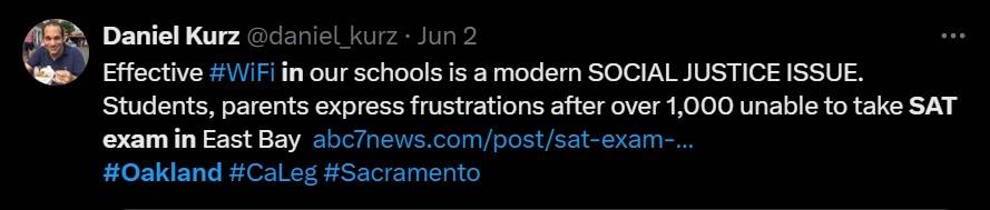 "Effective #WiFi in our schools is a modern SOCIAL JUSTICE ISSUE. Students, parents express frustrations after over 1,000 unable to take SAT exam in East Bay," said another news.