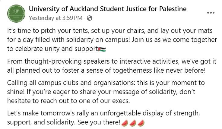 The University of Auckland Student Justice for Palestine invited students through Facebook page to gather with their tents outside the university library from 3 pm on Wednesday.