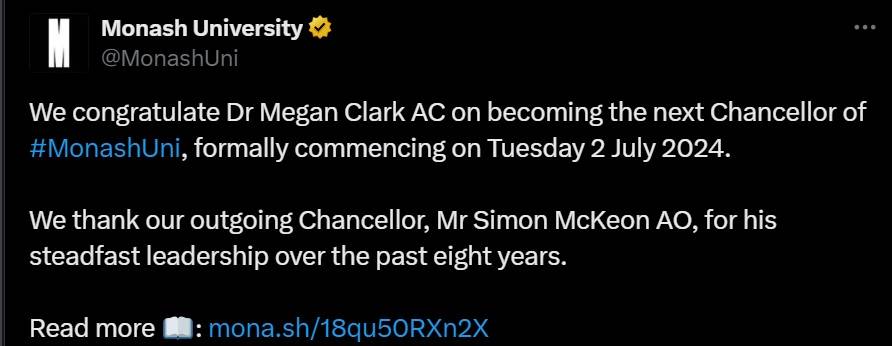 The university message on the X platform says, "We congratulate Dr Megan Clark AC on becoming the next Chancellor of #MonashUni, formally commencing on Tuesday 2 July 2024. We thank our outgoing Chancellor, Mr Simon McKeon AO, for his steadfast leadership over the past eight years."