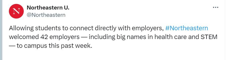 “Allowing students to connect directly with employers, #Northeastern welcomed 42 employers — including big names in health care and STEM — to campus this past week,” reads a message from Northeastern University on the X platform.