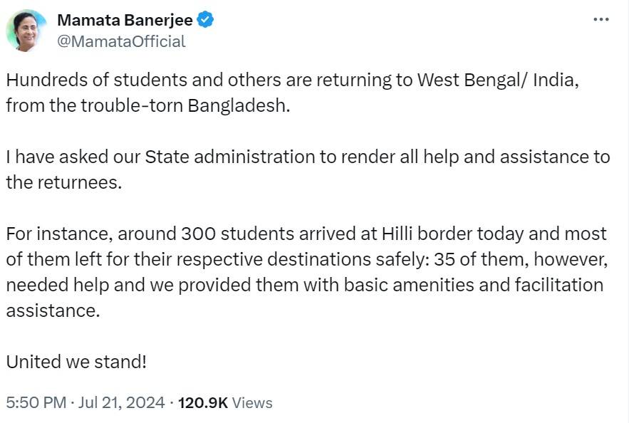"Hundreds of students and others are returning to West Bengal/ India, from the trouble-torn Bangladesh. I have asked our State administration to render all help and assistance to the returnees. For instance, around 300 students arrived at Hilli border today and most of them left for their respective destinations safely: 35 of them, however, needed help and we provided them with basic amenities and facilitation assistance. United we stand!," reads her message on X.