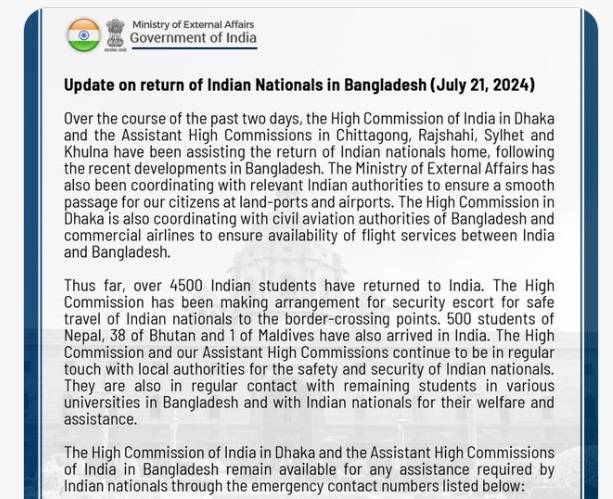 The Ministry of External Affairs released an update yesterday on returning students from Bangladesh. The Ministry said that it is in regular touch with the relevant Indian authorities so that students face no issues during their journey to India. so far, more than 4500 students have returned to India, MEA confirmed.