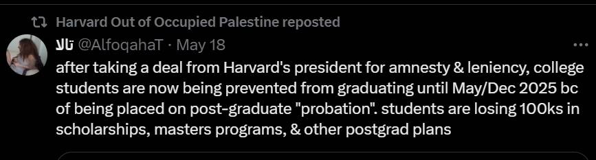 “After taking a deal from Harvard's president for amnesty & leniency, college students are now being prevented from graduating until May/Dec 2025 bc of being placed on post-graduate "probation". Students are losing 100ks in scholarships, masters programs, & other postgrad plans,” stated another message on X platform.