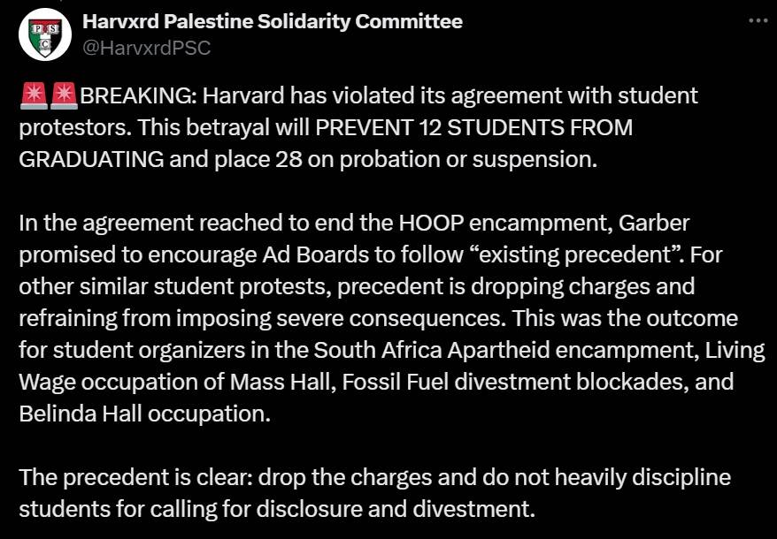 “Harvard has violated its agreement with student protestors. This betrayal will PREVENT 12 STUDENTS FROM GRADUATING and place 28 on probation or suspension. In the agreement reached to end the HOOP encampment, Garber promised to encourage Ad Boards to follow “existing precedent”. For other similar student protests, the precedent is dropping charges and refraining from imposing severe consequences. This was the outcome for student organizers in the South Africa Apartheid encampment, Living Wage occupation of Mass Hall, Fossil Fuel divestment blockades, and Belinda Hall occupation,” said another message.