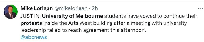 "JUST IN: University of Melbourne students have vowed to continue their protests inside the Arts West building after a meeting with university leadership failed to reach agreement this afternoon," reads a message on the X platform.